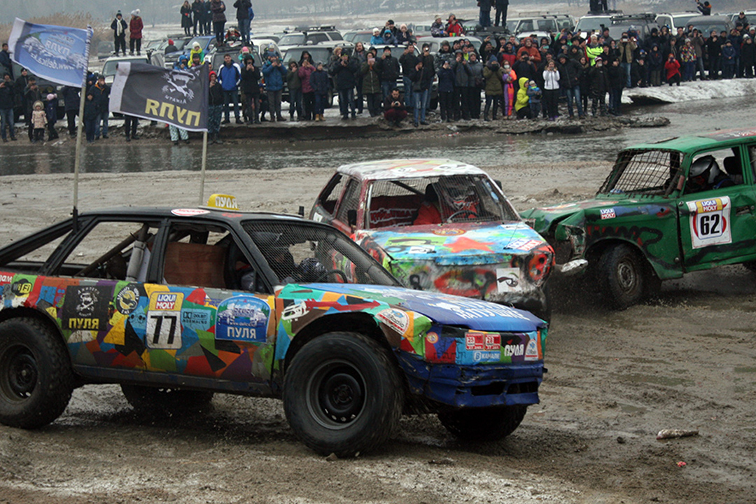 Всего на старт вышло 15 участников. Дмитрий Плясов боролся с соперниками довольно долго, но его бывшая кроссовая «восьмерка» в итоге застыла на площадке. Победу же разыграли между собой Александр и Ирина Осинцевы. Зеленый Иж-2125 Александра получил немало шрамов и вмятин, но смог-таки привезти своего водителя к победе. Кстати кроме дубля в «Дерби» семейный экипаж Осинцевых поднялся на пьедестал и за первое место в ТР5.