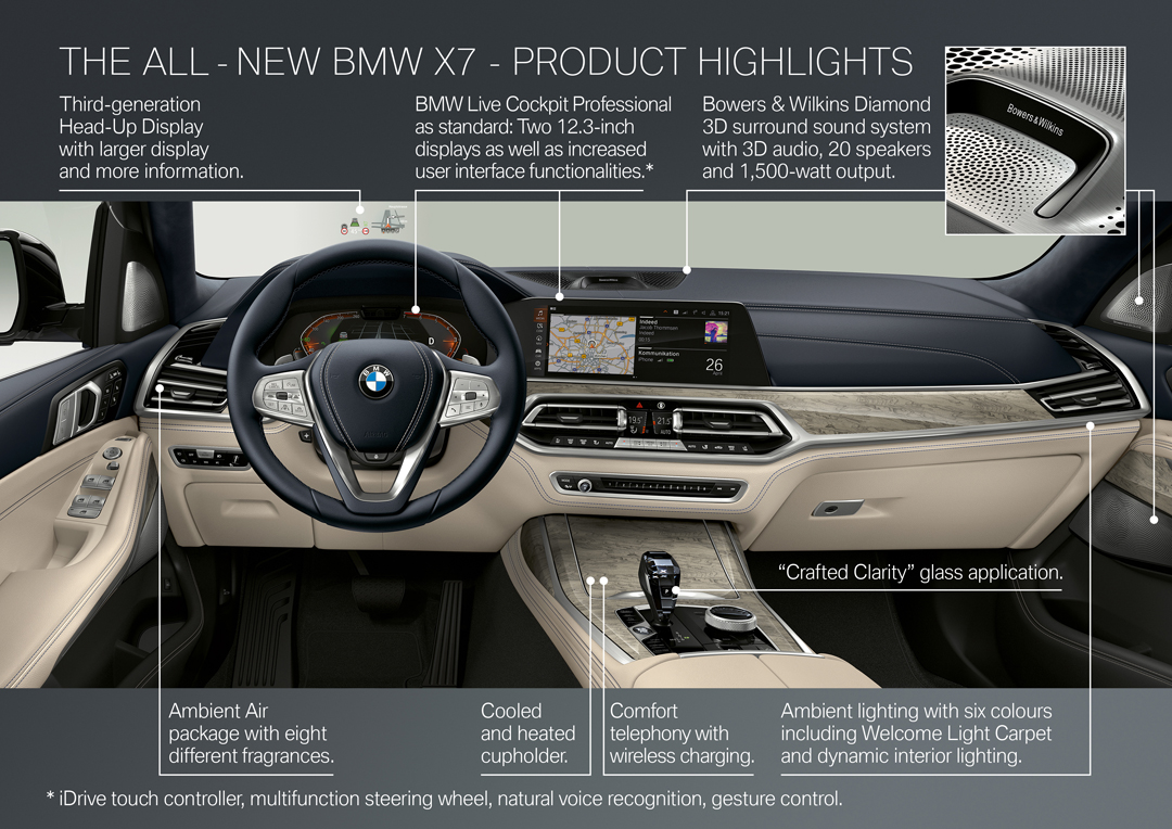 Изначально X7 станет выпускаться семиместным, потом по заказу сделают вариант с четырьмя посадочными местами — целых четыре отдельных комфортных кресла с вентиляцией и массажем! Адаптивные светодиодные фары тоже идут в базе, а в качестве опции предложен лазерно-люминофорный дальний свет.