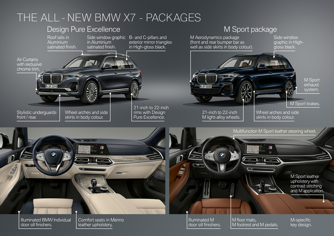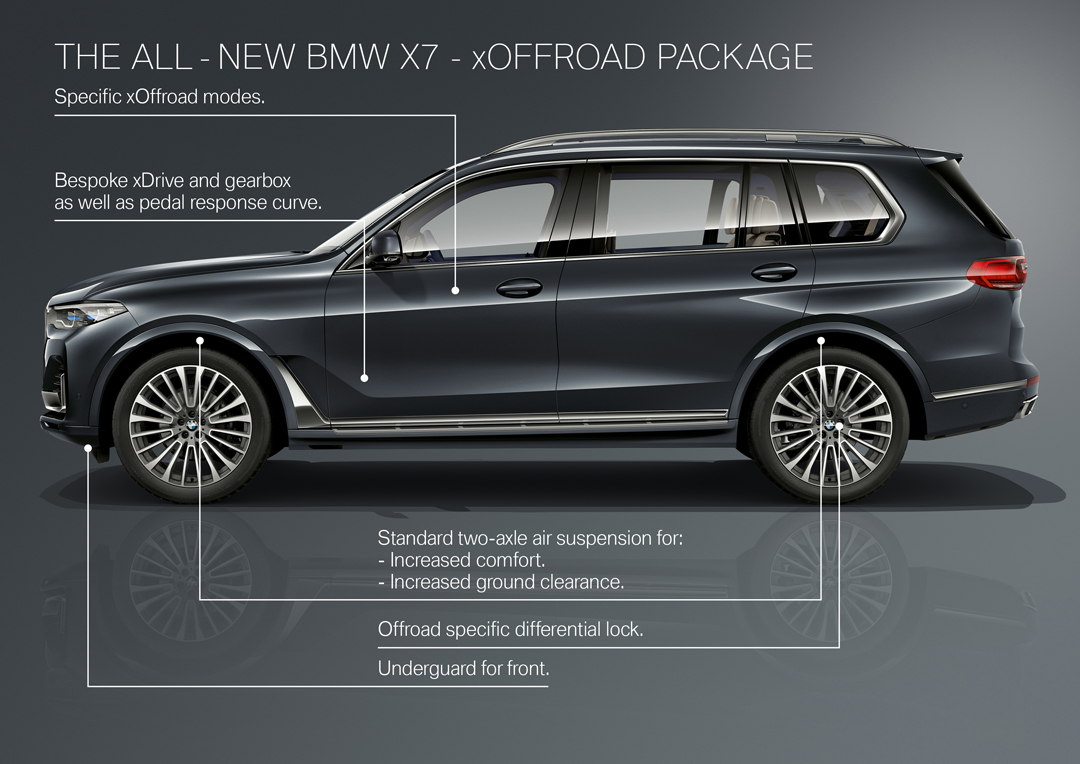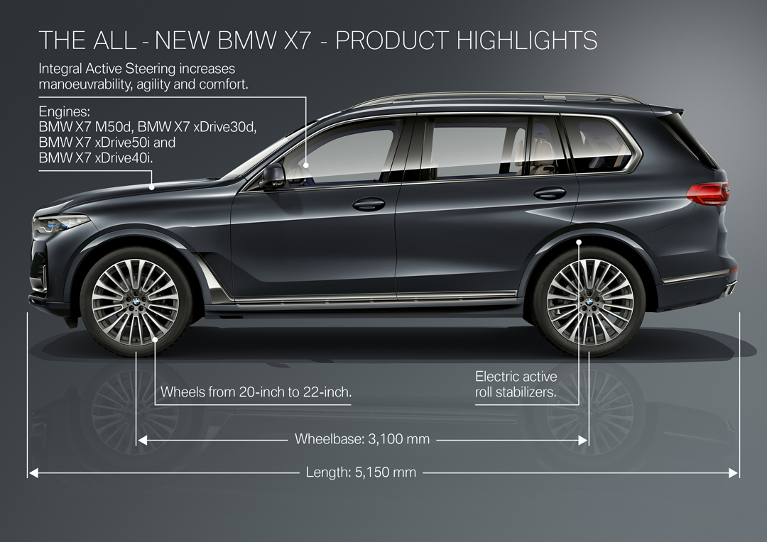 В основе X7 лежит свежая платформа CLAR с продольным расположением двигателя, которая уже применяется на седанах седьмой серии и последнем BMW X5. По сути, X7 является отмасштабированной версией BMW X5, с агрегатами и частью систем от семерки… От младшего собрата машина получила двустворчатую дверь багажника с раздельными электроприводами обеих створок. Объем багажника — от 326 литров за третьим рядом сидений до 2120 литров со сложенными вторым и третьим рядами.