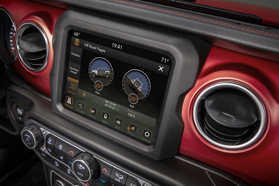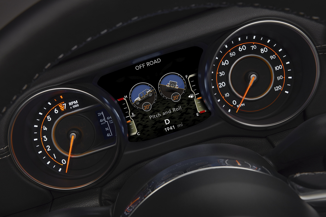 Внутри нового Wrangler современные технологии органично сплетаются с ретро стилем. К примеру панель приборов состоит из все еще аналоговых циферблатов тахометра и спидометра, между колодцами которых расположился дисплей бортового компьютера. В базовой комплектации он монохромный с диагональю 3.5 дюйма, а в топовой — цветной, 7-дюймовый.