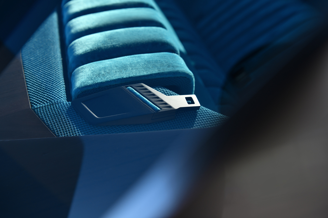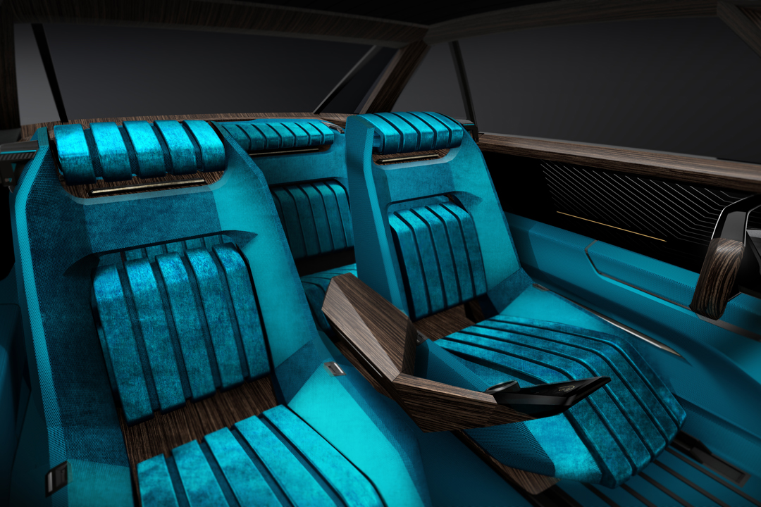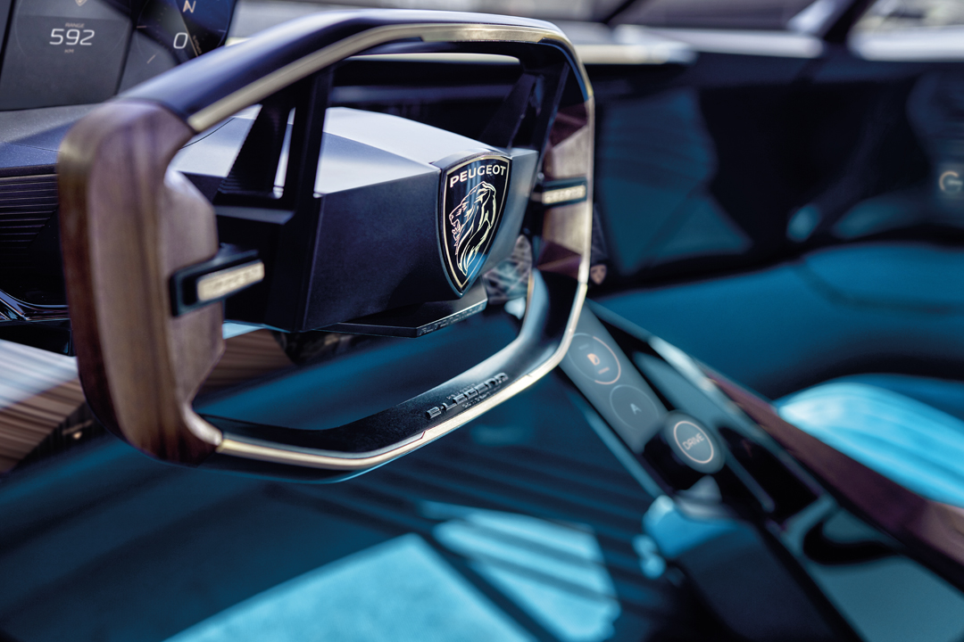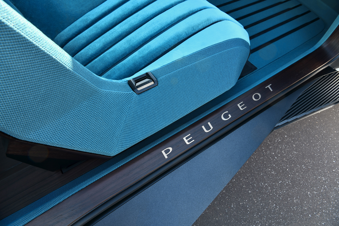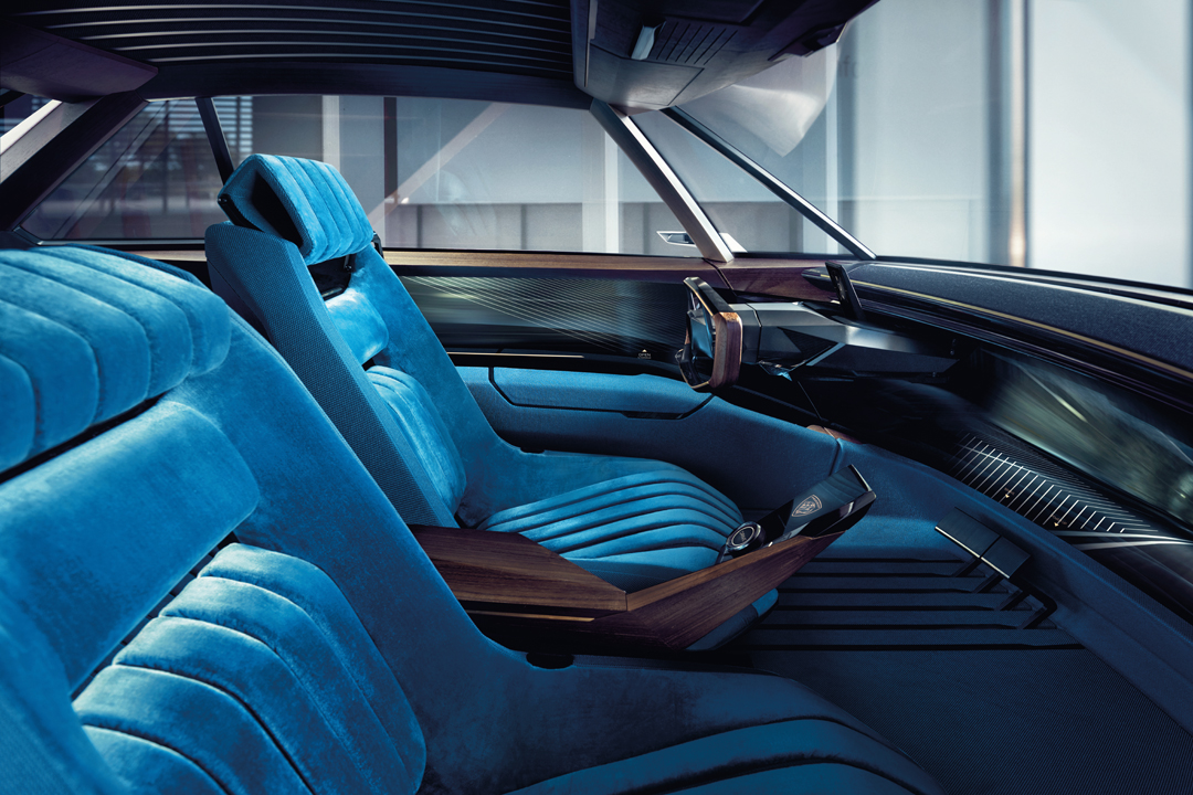 Peugeot e-Legend прекрасен не только снаружи: в салоне мы видим обаятельный ретро-велюр на креслах и натуральные вставки из новогвинейского ореха палдао. На этом фоне удивительно гармонично выглядит автопилотный руль, который скрывается в недрах торпедо при переходе в автономный режим. Сиденье водителя при этом трансформируется под комфортный режим перемещения.