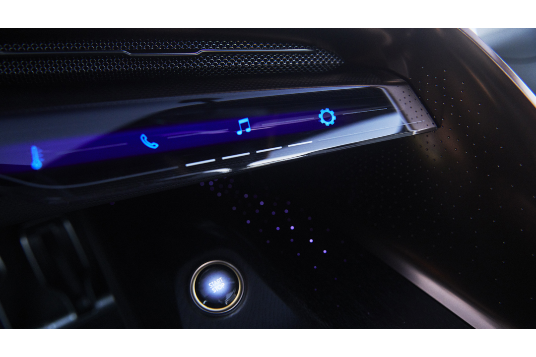 Концепту полагается быть ошеломляющим внутри. Окей, получите, распишитесь: кнопок почти нет, только цифровая приборная панель и большой дисплей по центру. Осталась лишь пимпочка «Старт/Стоп» и несколько пупырышек на рулевом колесе.