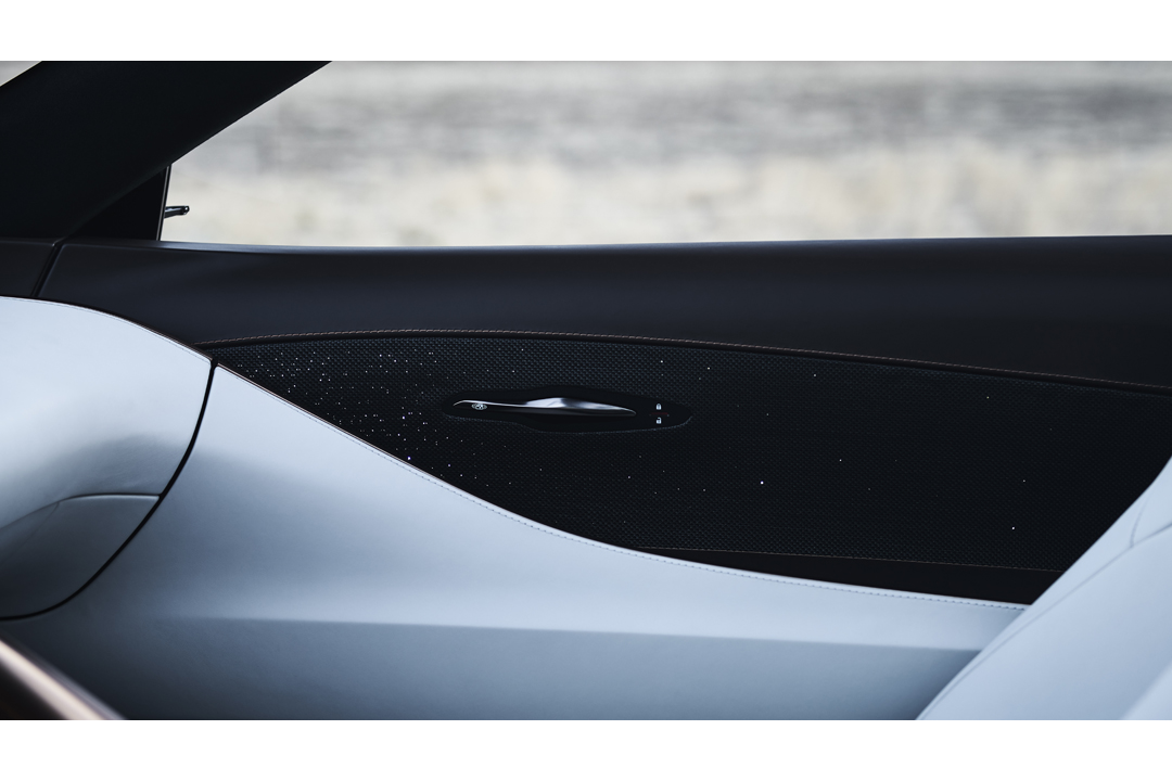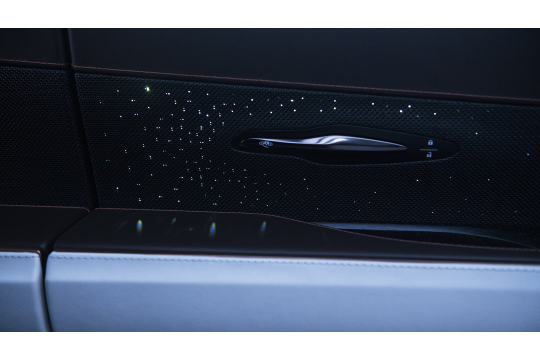 Повсюду щедро наклеены розовое золото, медь, натуральное дерево и нескольких видов кожи, в том числе перфорированной. Светодиодная подсветка имитирует космос, еще разок обыгрывая беспредельную тему.