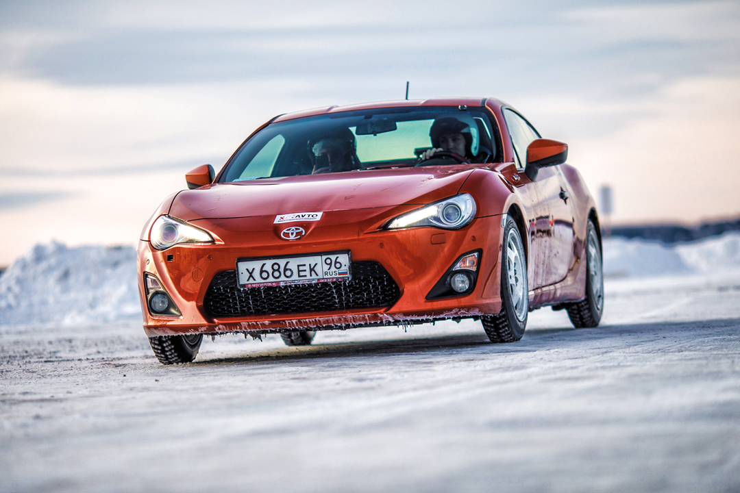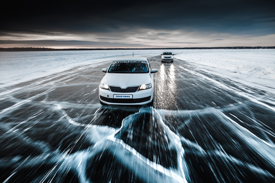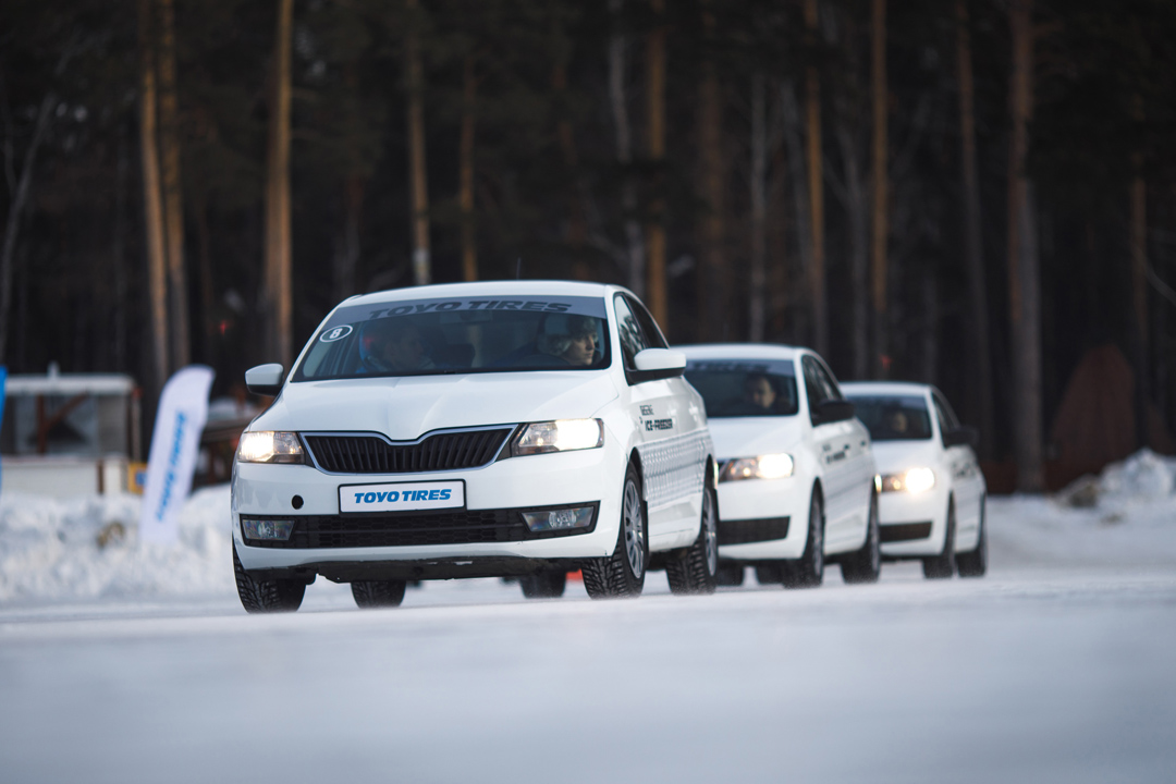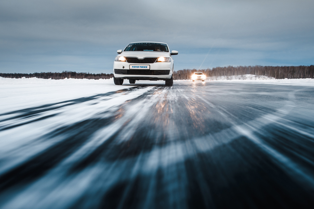 Отдельным тестом стало сочетание разгона и последующего торможения на прямом ледяном участке. Если специально не смотреть на спидометр во время ускорения, а затем и на рулетку на тормозном участке, то явно ощущается преимущества шины Toyo — автомобиль разгоняется бодрее и тормозит резче. В одном из заездов автомобили, обутые в Observe Ice-Freezer и шину-конкурента, останавливаются на одинаковой отметке тормозного пути примерно 30 м — и здесь… явно видно преимущество новинки, поскольку скорость перед торможением на шинах Toyo была примерно 43 км/ч, а сцепные свойства конкурентов позволили разогнаться до 39.5 км/ч. Если же выдерживать одинаковую скорость до начала торможения, то тормозной путь Observe Ice-Freezer всегда был на полтора-два метра короче.